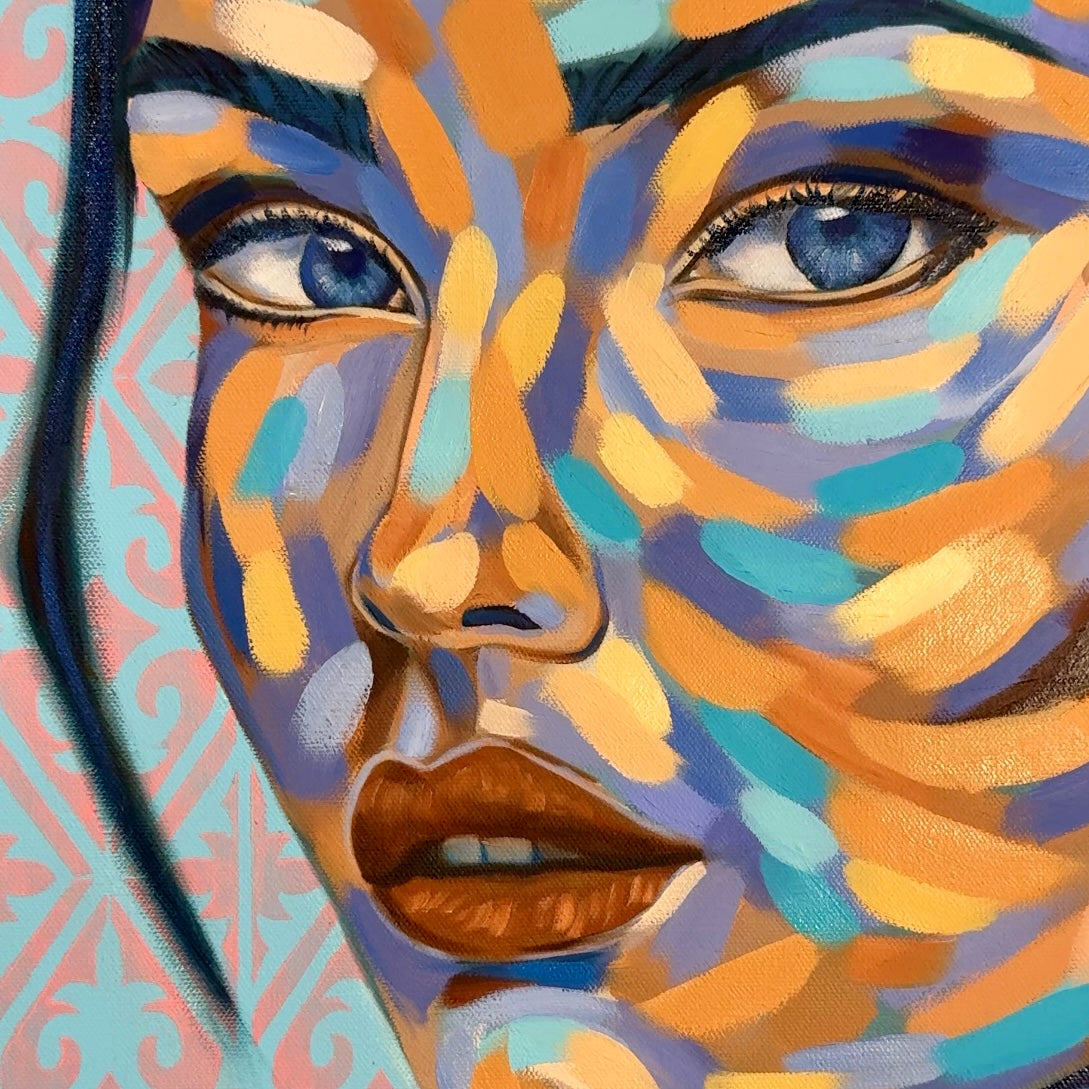 In my series of female portraits, I chose to combine oil and acrylic paints to depict women whose ethnic identity is not necessarily defined. I am not focused on their external appearance, but rather on their essence — on what they bring forth, the curiosity they spark in me, their unique energy, and the distinct color palette that characterizes each of them.